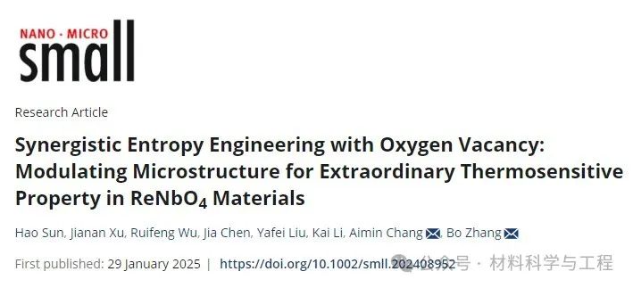 相關(guān)研究成果以題為Synergistic Entropy Engineering with Oxygen Vacancy: Modulating Microstructure for Extraordinary Thermosensitive Property in ReNbO4 Materials在《Small》期刊上發(fā)表,新疆理化技術(shù)研究所為唯一通訊單位,常愛(ài)民研究員和張博研究員為通訊作者,博士研究生孫皓為第一作者。該研究工作得到國(guó)家自然科學(xué)基金、中國(guó)科學(xué)院青年創(chuàng)新促進(jìn)會(huì)、新疆維吾爾自治區(qū)自然科學(xué)基金、新疆天山英才等項(xiàng)目的資助。